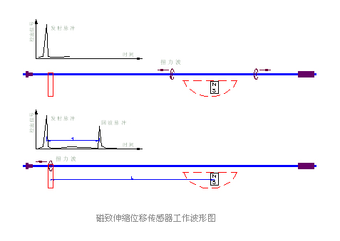 传感器工作时,电路部分将在波导丝上激励出脉冲电流,该电流沿波导丝传播时会在波导丝的周围产生脉冲电磁场。在传感器测杆外配有一浮子,此浮子可沿测杆随液位的变化而上下移动。在浮子内部有一组永久磁环。当脉冲电流磁场与浮子产生的磁环磁场相遇时,浮子周围的磁场发生改变从而使得由磁致伸缩材料做成的波导丝在浮子所在的位置产生一个扭转波脉冲,这个脉冲以固定的速度沿波导丝传回并由检出机构检出。通过测量脉冲电流与扭转波的时间差可以精确地确定浮子所在的位置,即液面的位置。
